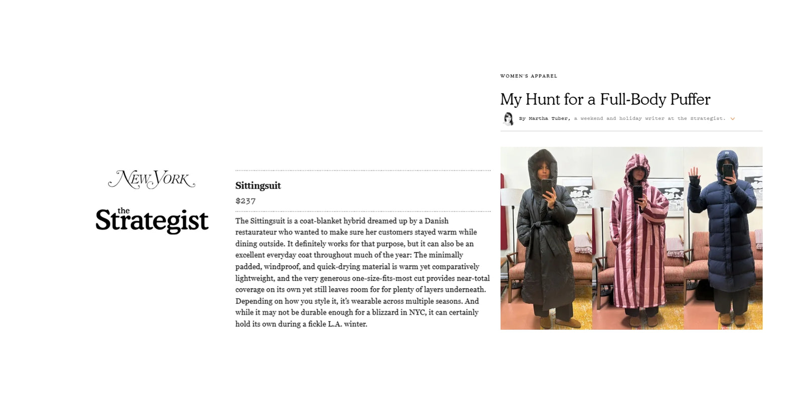 "The Sittingsuit is a coat-blanket hybrid dreamed up by a Danish restaurateur who wanted to make sure her customers stayed warm while dining outside. The minimally padded, windproof, and quick-drying material is warm yet comparatively lightweight, and the very generous one-size-fits-most cut provides near-total coverage on its own yet still leaves room for plenty of layers underneath."