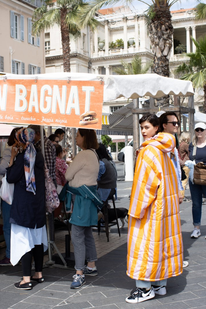 The body length measurement is 172cm, but to give you a rough guide, I’m 5′ 10” and it sits just a little below halfway down my calf. I love the feeling of being wrapped up from head to toe. The suit has no pockets, but the slits where they would usually be are practical for access to the pockets in the clothing you have on below. The beauty of this is that there’s no need to transfer your phone, keys or wallet when you pop the Sittingsuit on.