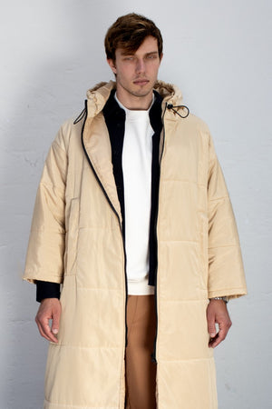Der Saum der Kapuze ist mit einem Gummizug versehen, der sich nach Bedarf zuziehen lässt. Durch die überdimensionierte Kapuze lässt sich darunter problemlos ein Mantel tragen, der ebenfalls eine Kapuze hat. Also mit Doppelschutz durch Wind und Wetter!