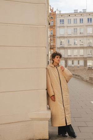 Der Saum der Kapuze ist mit einem Gummizug versehen, der sich nach Bedarf zuziehen lässt. Durch die überdimensionierte Kapuze lässt sich darunter problemlos ein Mantel tragen, der ebenfalls eine Kapuze hat. Also mit Doppelschutz durch Wind und Wetter!