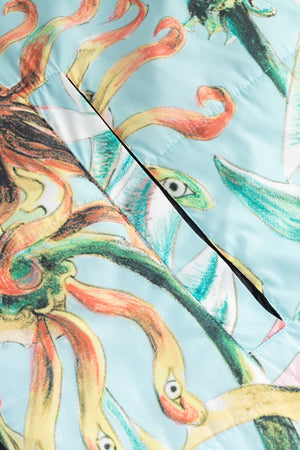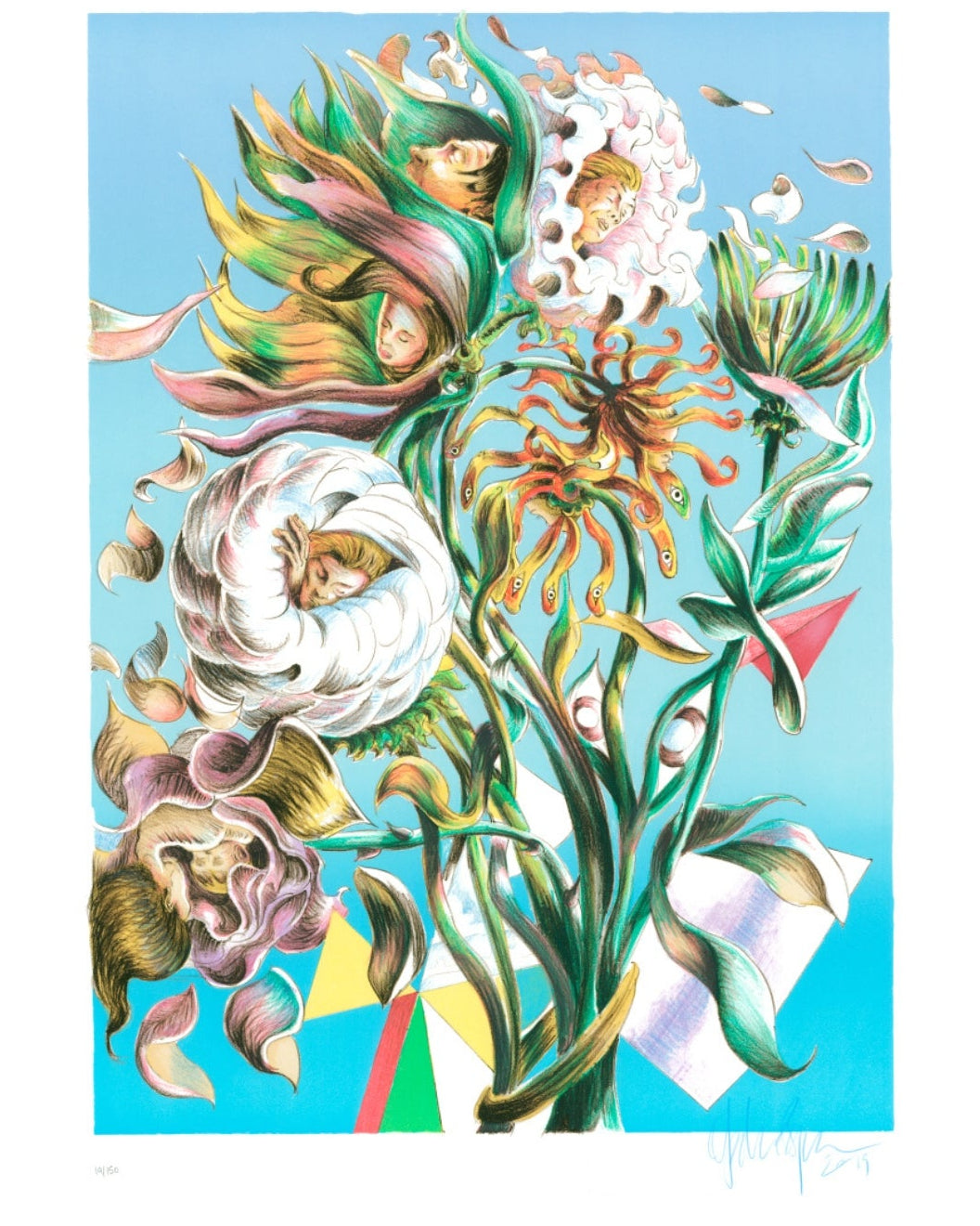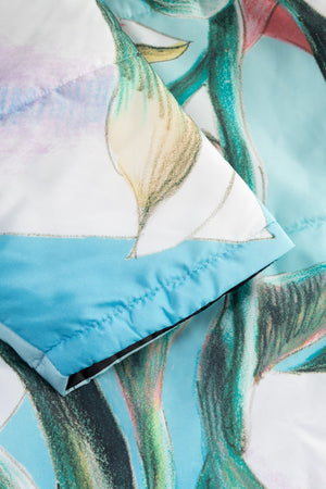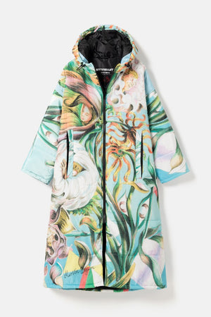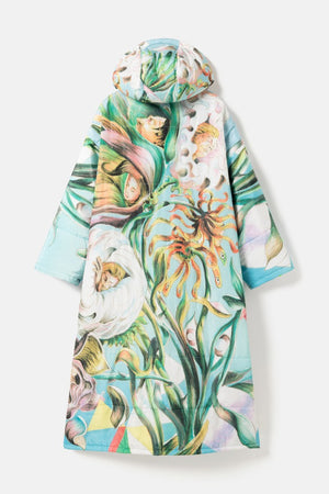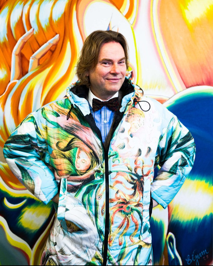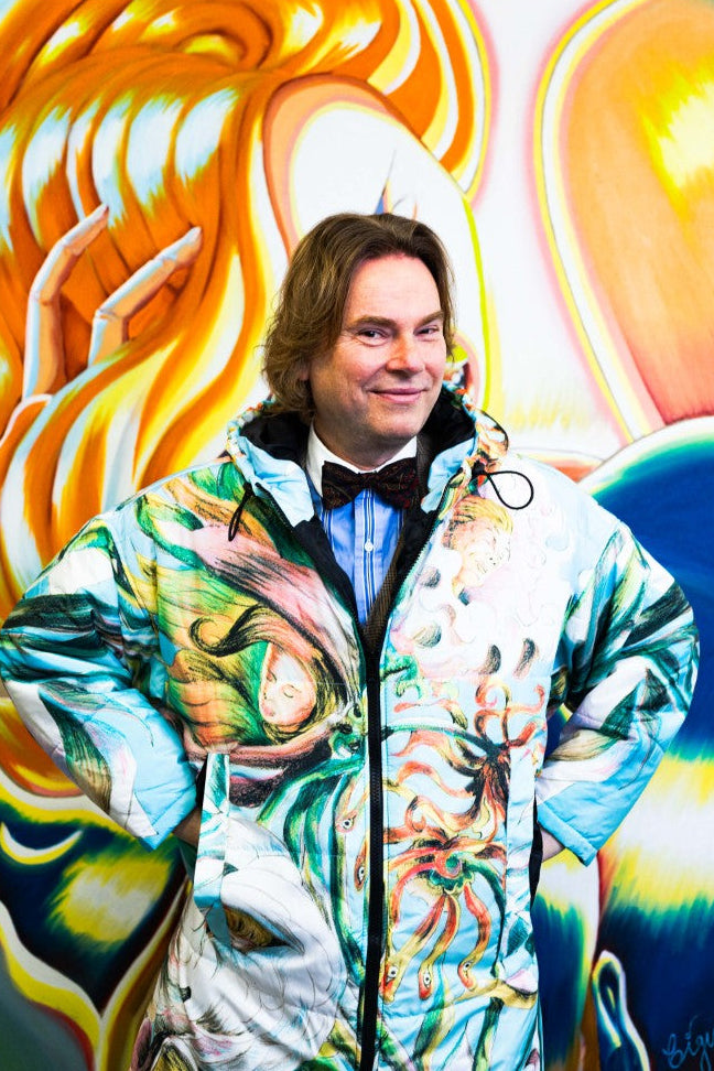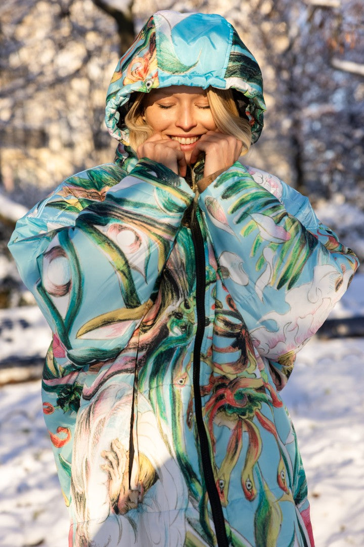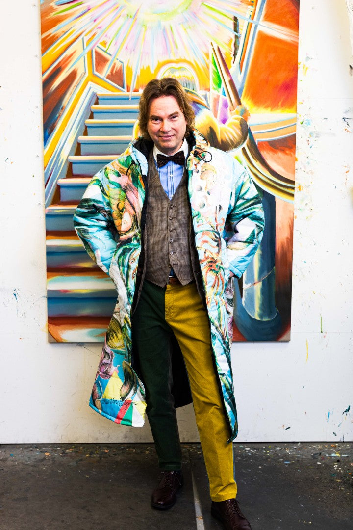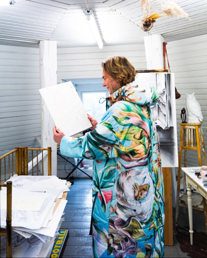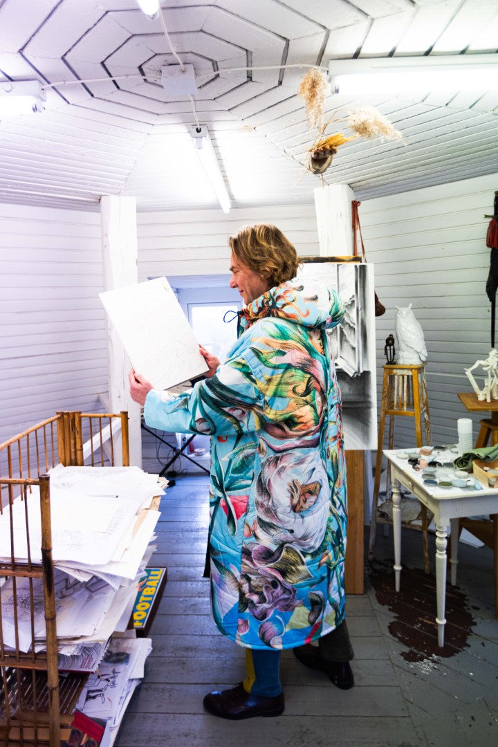 “I saw the actress Patricia Schumann wearing an earlier Sittingsuit, also based on a painting. I stopped her and said: who made that coat? You are a walking painting. I have always made my art to communicate with as many people as possible, without losing anything of the work. When people see this piece, they will step into a light blue space. Inside, swirling flowers with faces create an experience of their own.”