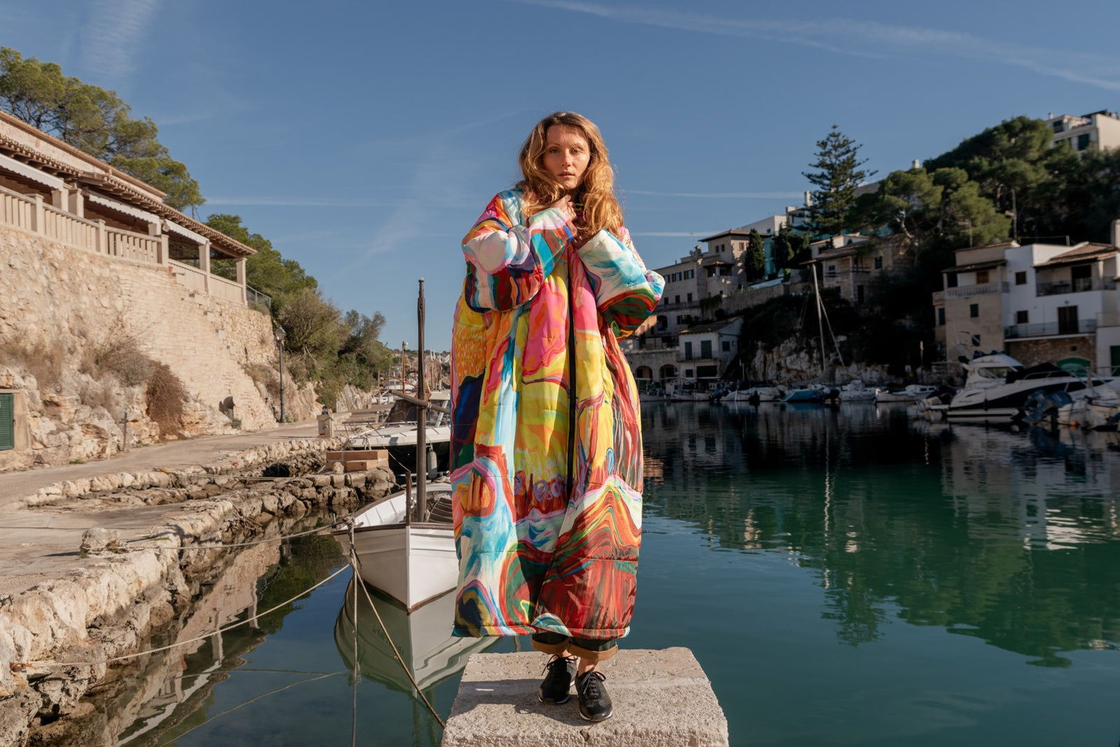 Based on the original artwork "Cosmic Dance" by Danish artist Lin Utzon. Known for her ceramic murals and abstract forms, Utzon’s work has appeared globally in museums and galleries. This edition extends her Cosmic Dance project into wearable art, where nature and transformation are expressed through movement and design.