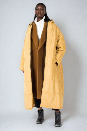 Der Saum der Kapuze ist mit einem Gummizug versehen, der sich nach Bedarf zuziehen lässt. Durch die überdimensionierte Kapuze lässt sich darunter problemlos ein Mantel tragen, der ebenfalls eine Kapuze hat. Also mit Doppelschutz durch Wind und Wetter!