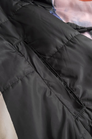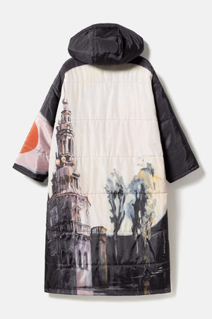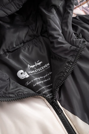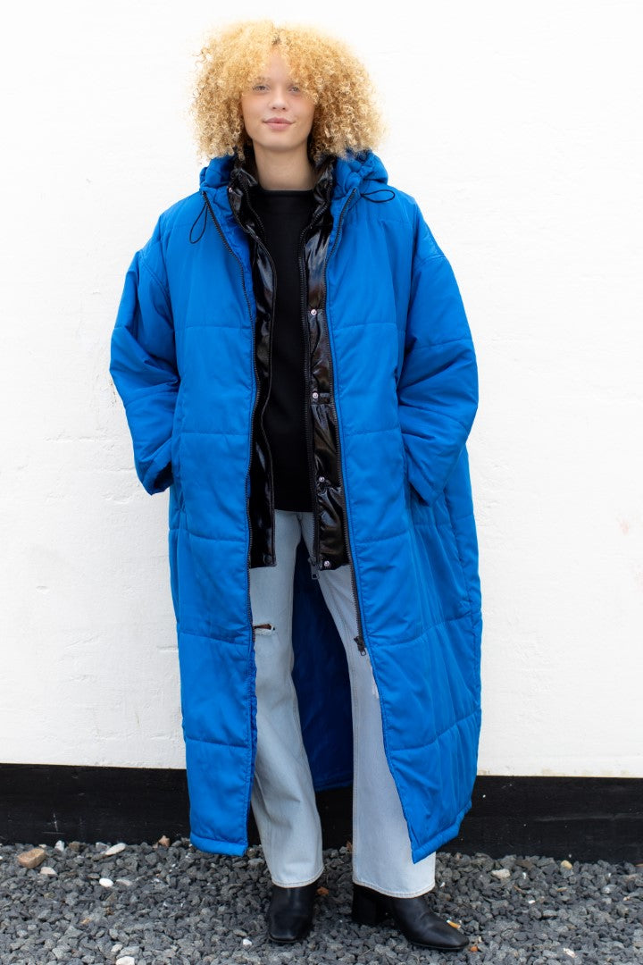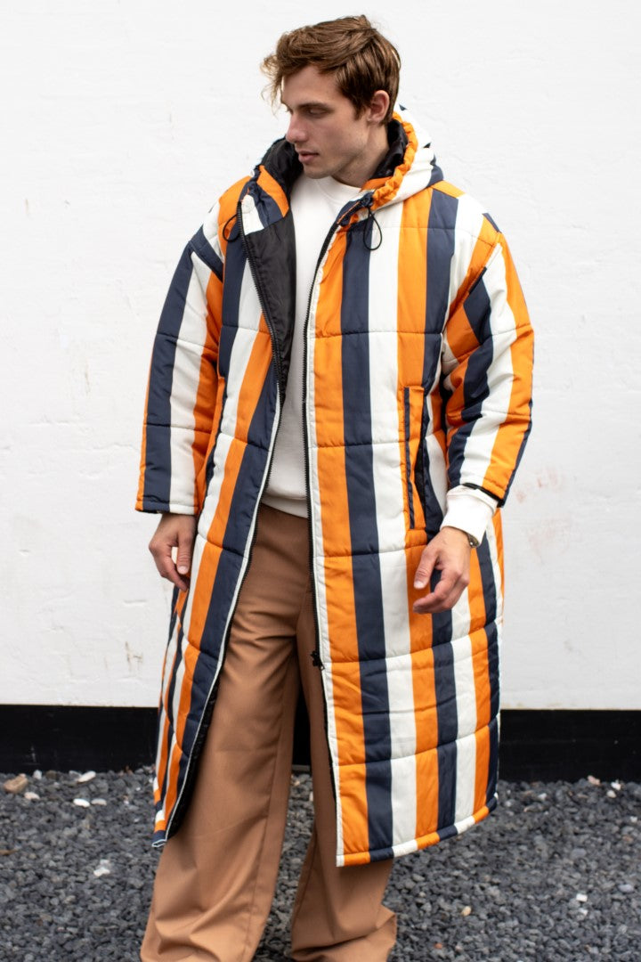 Der Saum der Kapuze ist mit einem Gummizug versehen, der sich nach Bedarf zuziehen lässt. Durch die überdimensionierte Kapuze lässt sich darunter problemlos ein Mantel tragen, der ebenfalls eine Kapuze hat. Also mit Doppelschutz durch Wind und Wetter!