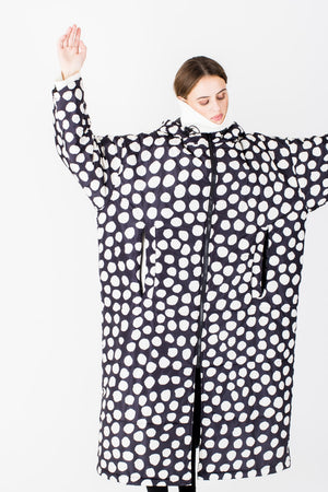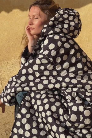 Der Saum der Kapuze ist mit einem Gummizug versehen, der sich nach Bedarf zuziehen lässt. Durch die überdimensionierte Kapuze lässt sich darunter problemlos ein Mantel tragen, der ebenfalls eine Kapuze hat. Also mit Doppelschutz durch Wind und Wetter!