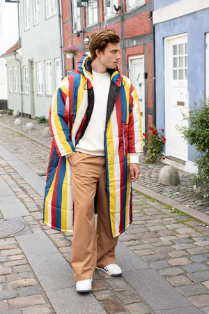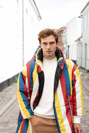 Der Saum der Kapuze ist mit einem Gummizug versehen, der sich nach Bedarf zuziehen lässt. Durch die überdimensionierte Kapuze lässt sich darunter problemlos ein Mantel tragen, der ebenfalls eine Kapuze hat. Also mit Doppelschutz durch Wind und Wetter!