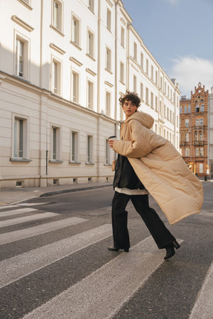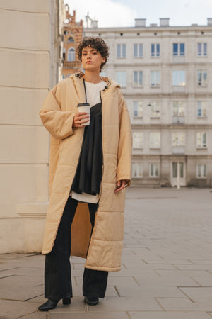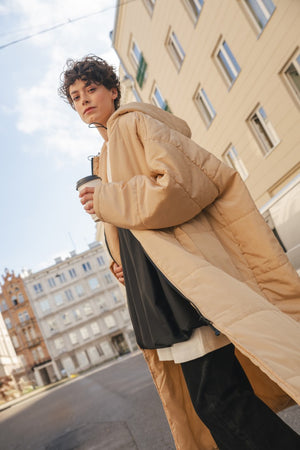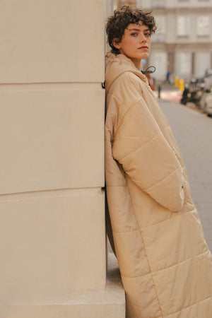 Der Saum der Kapuze ist mit einem Gummizug versehen, der sich nach Bedarf zuziehen lässt. Durch die überdimensionierte Kapuze lässt sich darunter problemlos ein Mantel tragen, der ebenfalls eine Kapuze hat. Also mit Doppelschutz durch Wind und Wetter!