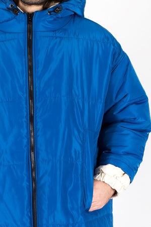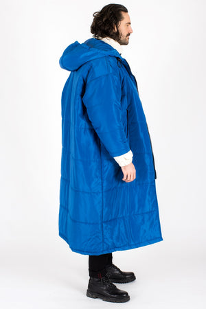 Der Saum der Kapuze ist mit einem Gummizug versehen, der sich nach Bedarf zuziehen lässt. Durch die überdimensionierte Kapuze lässt sich darunter problemlos ein Mantel tragen, der ebenfalls eine Kapuze hat. Also mit Doppelschutz durch Wind und Wetter!