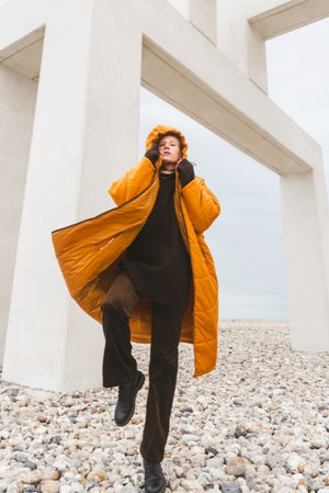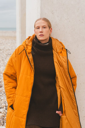 Der Saum der Kapuze ist mit einem Gummizug versehen, der sich nach Bedarf zuziehen lässt. Durch die überdimensionierte Kapuze lässt sich darunter problemlos ein Mantel tragen, der ebenfalls eine Kapuze hat. Also mit Doppelschutz durch Wind und Wetter!