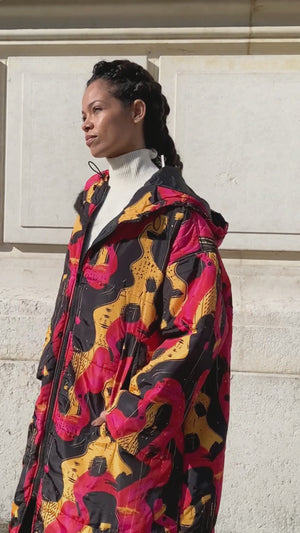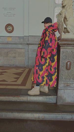 Der Saum der Kapuze ist mit einem Gummizug versehen, der sich nach Bedarf zuziehen lässt. Durch die überdimensionierte Kapuze lässt sich darunter problemlos ein Mantel tragen, der ebenfalls eine Kapuze hat. Also mit Doppelschutz durch Wind und Wetter!