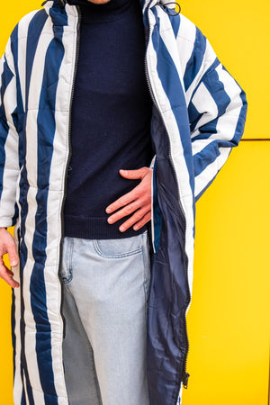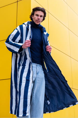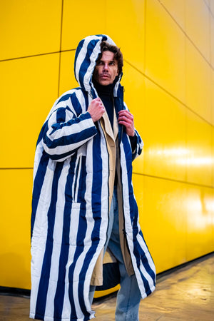 Der Saum der Kapuze ist mit einem Gummizug versehen, der sich nach Bedarf zuziehen lässt. Durch die überdimensionierte Kapuze lässt sich darunter problemlos ein Mantel tragen, der ebenfalls eine Kapuze hat. Also mit Doppelschutz durch Wind und Wetter!