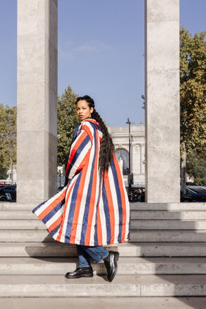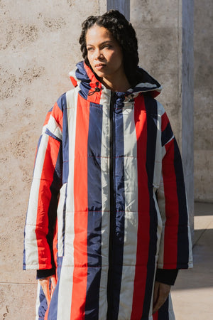 Der Saum der Kapuze ist mit einem Gummizug versehen, der sich nach Bedarf zuziehen lässt. Durch die überdimensionierte Kapuze lässt sich darunter problemlos ein Mantel tragen, der ebenfalls eine Kapuze hat. Also mit Doppelschutz durch Wind und Wetter!