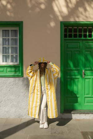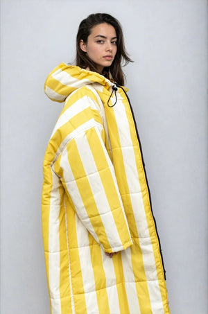 Der Saum der Kapuze ist mit einem Gummizug versehen, der sich nach Bedarf zuziehen lässt. Durch die überdimensionierte Kapuze lässt sich darunter problemlos ein Mantel tragen, der ebenfalls eine Kapuze hat. Also mit Doppelschutz durch Wind und Wetter!