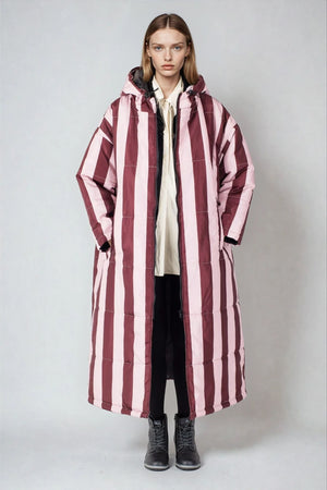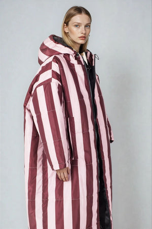 Der Saum der Kapuze ist mit einem Gummizug versehen, der sich nach Bedarf zuziehen lässt. Durch die überdimensionierte Kapuze lässt sich darunter problemlos ein Mantel tragen, der ebenfalls eine Kapuze hat. Also mit Doppelschutz durch Wind und Wetter!