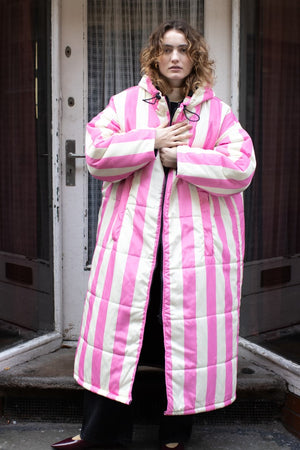 Der Saum der Kapuze ist mit einem Gummizug versehen, der sich nach Bedarf zuziehen lässt. Durch die überdimensionierte Kapuze lässt sich darunter problemlos ein Mantel tragen, der ebenfalls eine Kapuze hat. Also mit Doppelschutz durch Wind und Wetter!