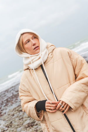 Der Saum der Kapuze ist mit einem Gummizug versehen, der sich nach Bedarf zuziehen lässt. Durch die überdimensionierte Kapuze lässt sich darunter problemlos ein Mantel tragen, der ebenfalls eine Kapuze hat. Also mit Doppelschutz durch Wind und Wetter!